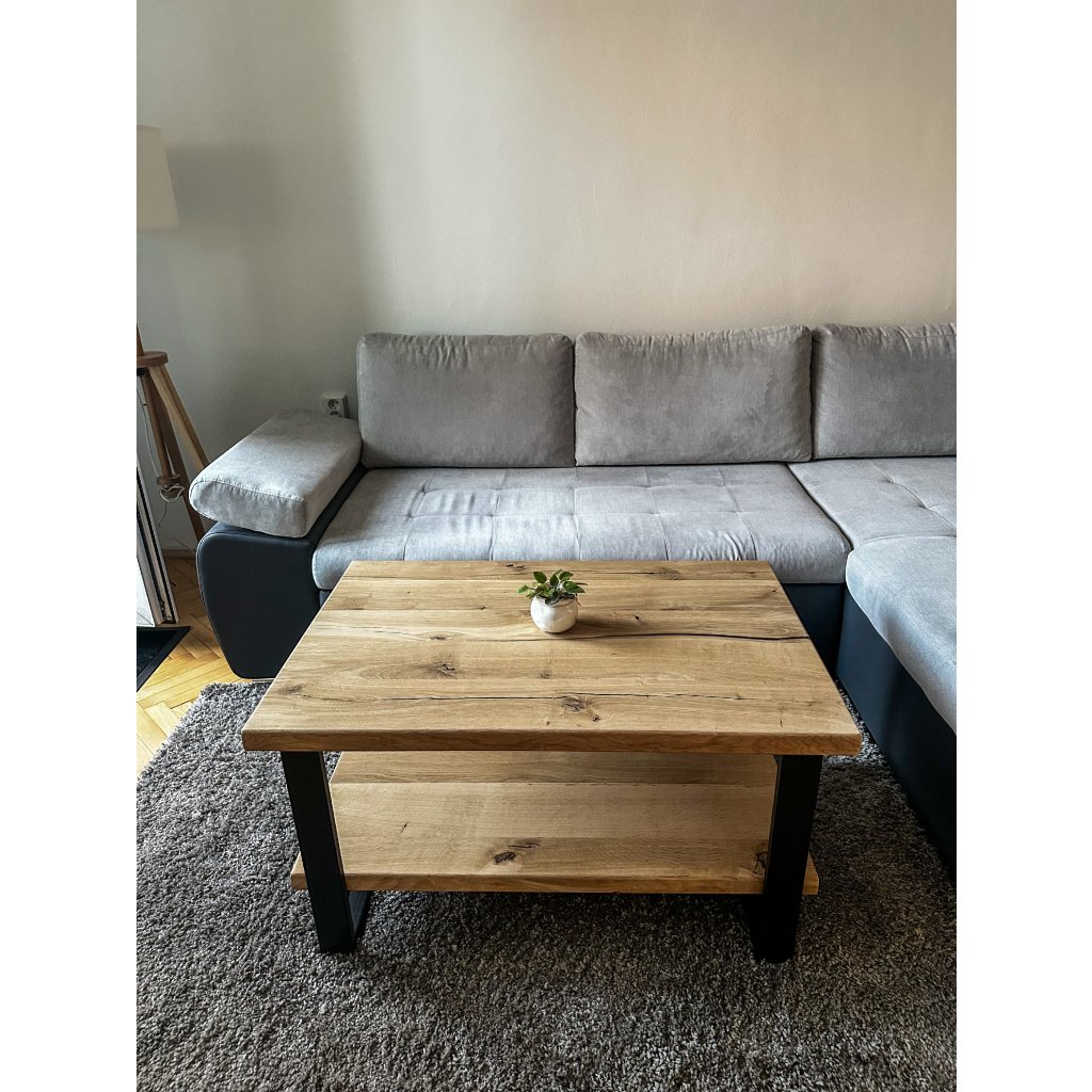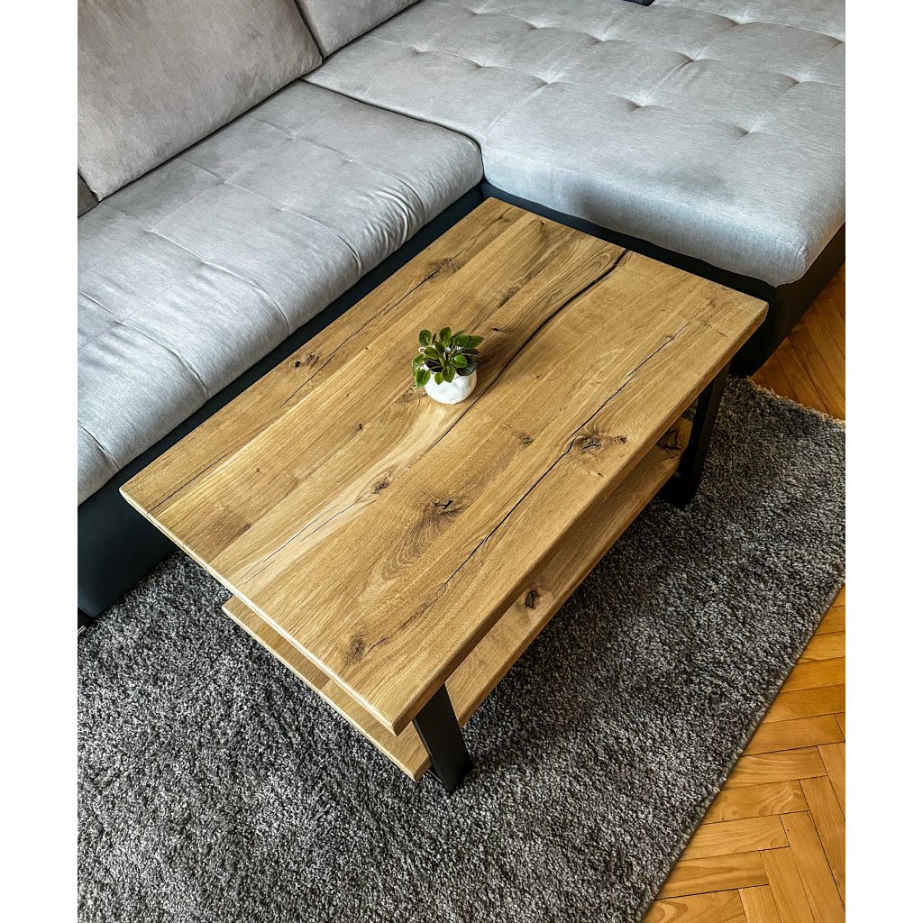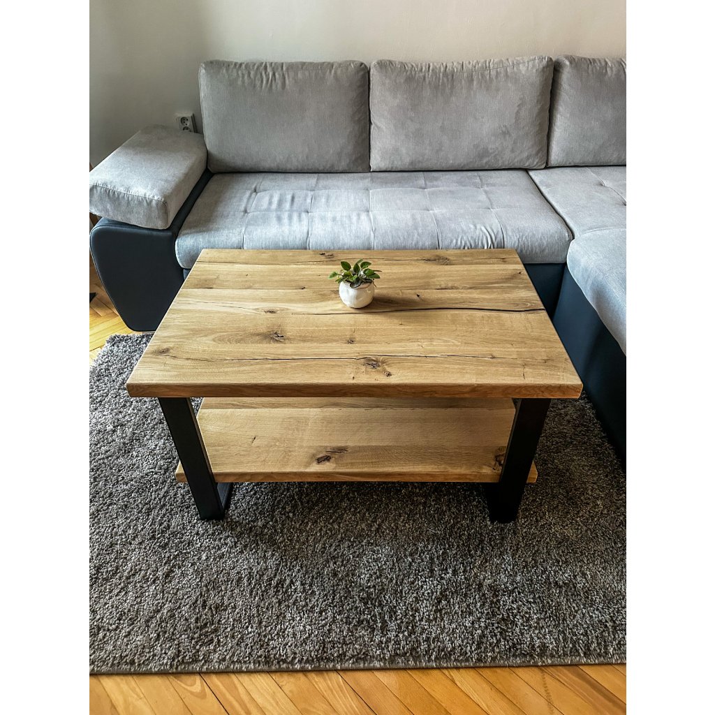 Masivní konferenční stůl DOUBLE z dubového dřeva a černé oceli pro moderní i industriální interiéry. Ručně zpracovaná deska se zachovanou přírodní strukturou a praktická odkládací police. Ideální do obývacího pokoje, kanceláře i stylové kavárny.